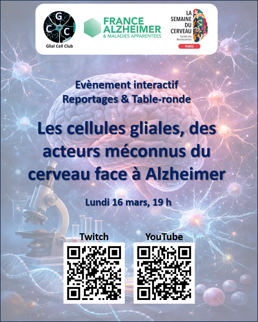Ce rendez-vous live sur YouTube (https://www.youtube.com/@francealzheimer) et Twitch (https://www.twitch.tv/glialcellclub) vous fera de découvrir les recherches en cours sur ce sujet passionnant de manière accessible au grand public. Il permettra de comprendre les enjeux actuels de la recherche et saisir l’importance des approches complémentaires et des interactions entre laboratoires pour faire avancer la lutte contre la maladie d’Alzheimer. Cet événement est organisé par France Alzheimer et le Club des Cellules Gliales pour la Semaine du Cerveau 2026.